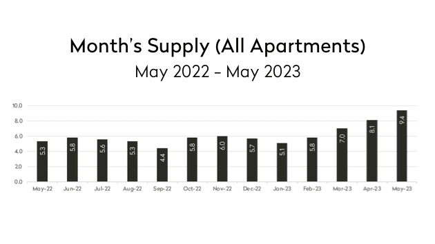 While beyond what is traditionally considered a balanced market (a supply rate of 6-7 months), May’s supply rate was the same as it was last year but well above that of May 2022 when the supply rate was 5.3 months.