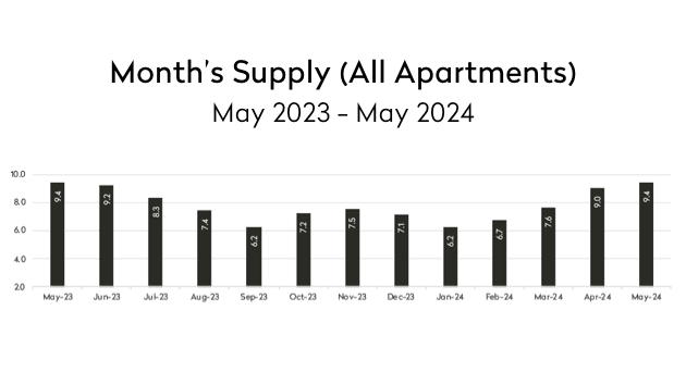Condos posted a supply rate of 11.3 months in May, unchanged from April but up from May 2023 when the supply rate was 10 months. There were 3,761 condos on the market in May, up 10% from April when there were 3,415 but only about 0.8% up from May 2023 when there were 3,730 condo listings. The notable increase in supply rate between May 2024 and May 2023 and marginal increase in inventory suggests a market that is absorbing condos more slowly this year than last.