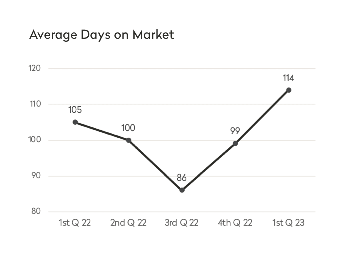 As for activity, as noted above there were 2,699 closings in Q1 2023 which represents a 33% drop from last year when there were 4,023 closings during record levels of activity. That said, activity in Q1 2023 was in line with the pre-pandemic years (Q1 2018-2020) when there were an average of 2,502 closings. With regard to how quickly property is trading, inventory has been increasing steadily since January of this year and so it’s not surprising that last quarter we saw a higher average for days on market at 114 days, up from 99 days in Q4 2022 and 105 days in Q1 2022. To that end, we’ve also seen greater flexibility from sellers as sale prices achieve on average 97.4% of last asking price, down from last year when they achieved 98%.