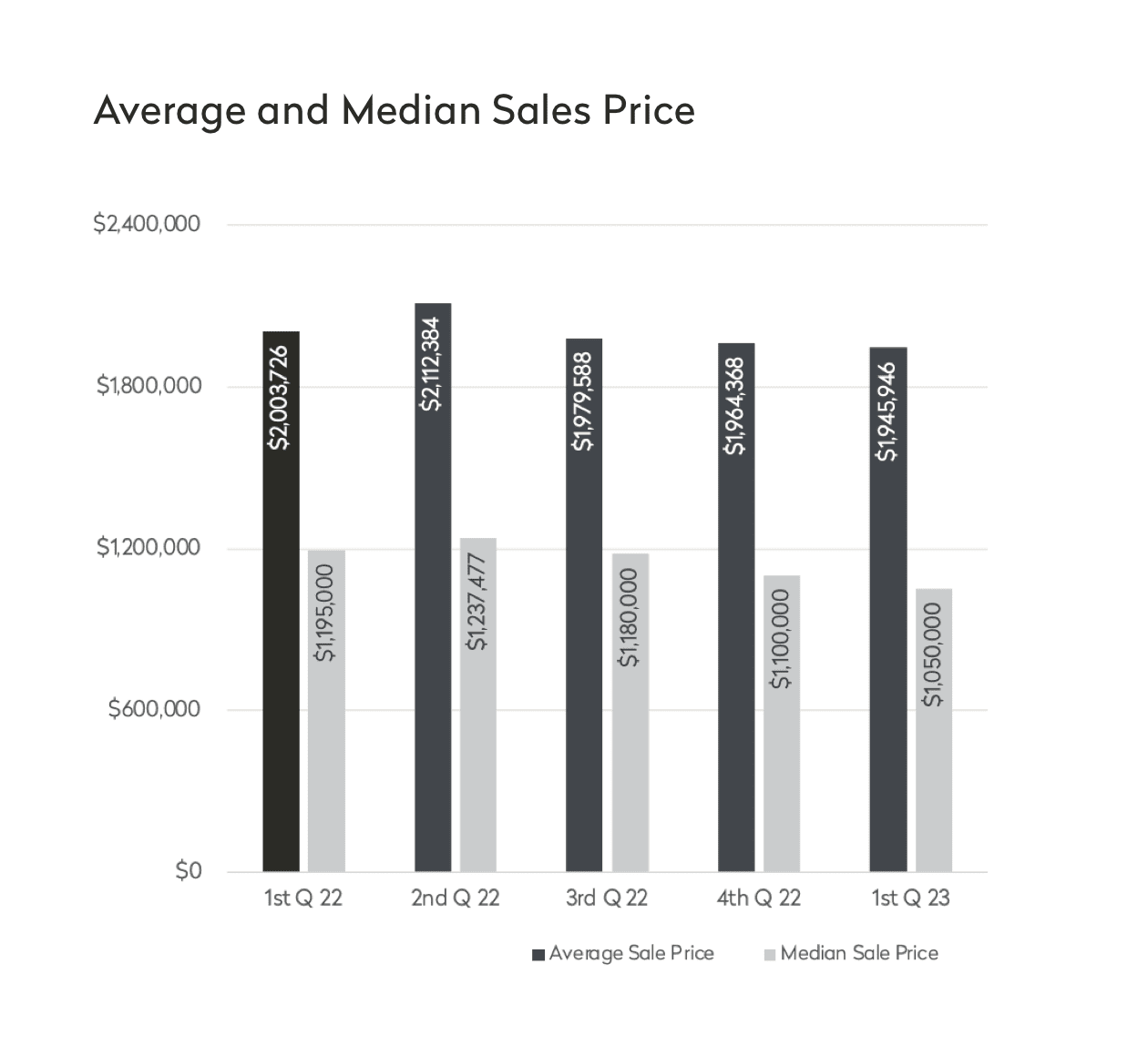 Putting those weekly averages into context with the market at large, the average Manhattan apartment sales price in Q1 2023 was $1,945,946 in Q1 2023 which was consistent with where average sales prices were in Q4 2022 when they were $1,964,368. The average apartment sales price declined approximately 3% from Q1 2022 when it was $2,003,726. The median sale price fell 12% from last year to $1,050,000 from $1,195,000 which is likely in great part representative of the slowdown in the upper luxury segment of the market we’ve seen over the past year.