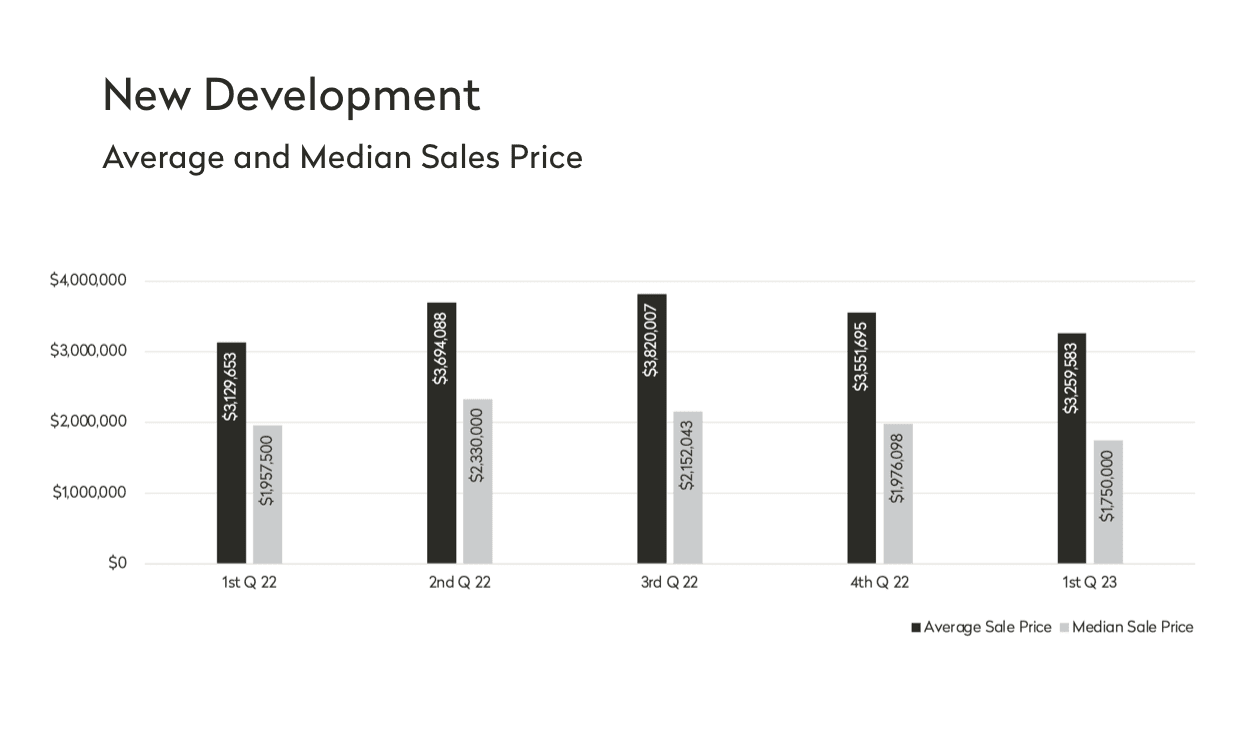 By contrast, the average condo sold for $2,987,892 in Q1 2023 representing an 8% increase from last year when it was $2,752,691. This rise was driven in great part by 3+ bedroom condo resale prices which were up 24% to $6,085,897 in Q1 2023 from $4,923,006 last year as well as new development sales which averaged $3,259,583 in Q1 2023, up 4% from last year when they averaged $3,129,653.