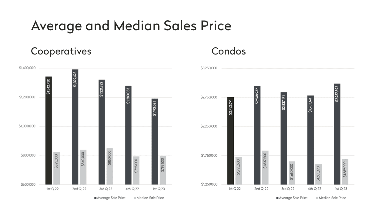 We are now seeing increased softness in cooperative apartments compared to condos which is isn’t surprising as the typical condo comes with more amenities and newer finishes with fewer rules and more flexibility in ownership structure and financing which is more attractive to buyers looking for value. While it’s too early to say whether or not this will be a trend that continues, the opposite directions in which average prices for cooperatives and condominiums have moved since last year is something to keep an eye on. Last quarter every size category of cooperative apartments saw lower sale prices as the average price of a cooperative apartment in Q1 2023 fell to $1,192,034 from $1,342,730 last year, representing a 13% decrease year over year.