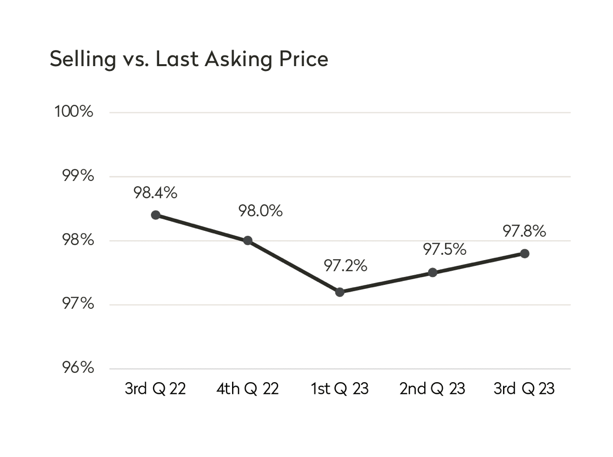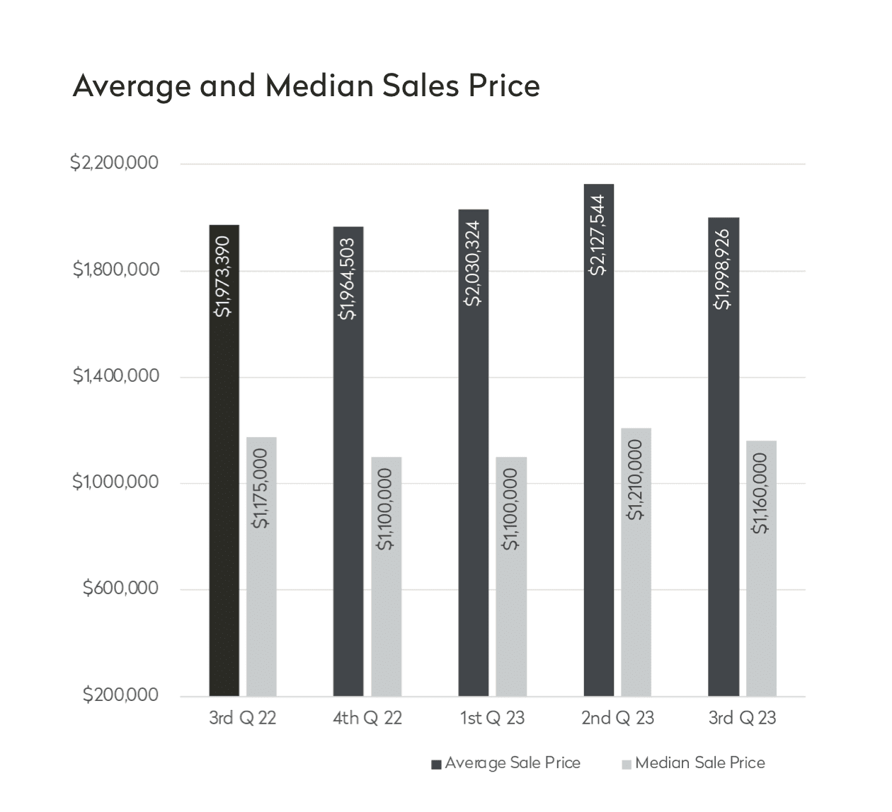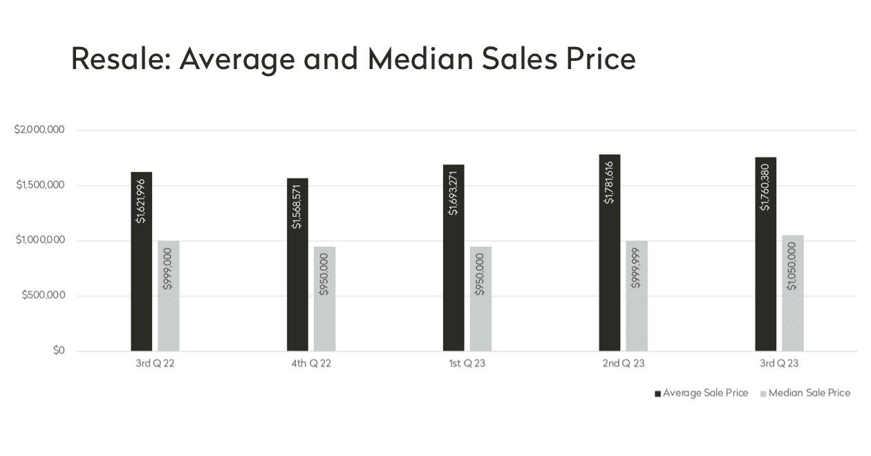 Resale had a much stronger quarter as prices averaged 9% higher than last year, up to $1,760,380 from $1,621,996. The median price was $1,050,000 in Q3 2023, crossing the $1M mark for the first time since Q2 2022 when it was also $1,050,000.