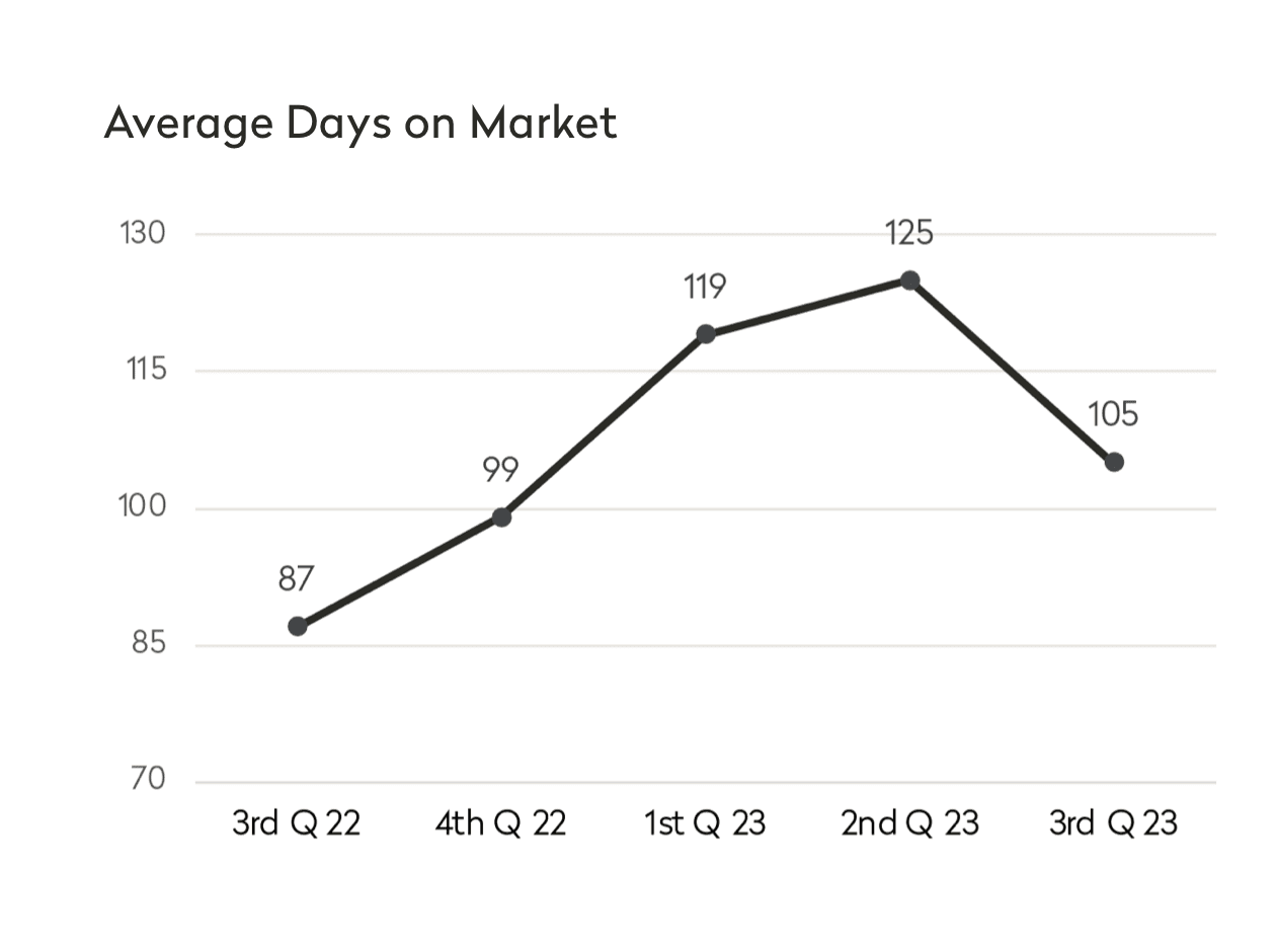 While resale co-ops saw marginal declines, resale condo average sales prices surged 13% to $2,422,727 in Q3 2023 from $2,149,682 last year. Leading the gains, 3+ bedroom condos saw their prices increase 21% to $5,927,276 from $4,882,098. As you’ll see expressed above, time on market was down 16% in Q3 2023 to 105 days compared to the quarter prior when it was 125 days. That said, the average time on market remains about 21% higher than it was a year ago when the data was still influenced by the tail end of record high levels of activity in our market.