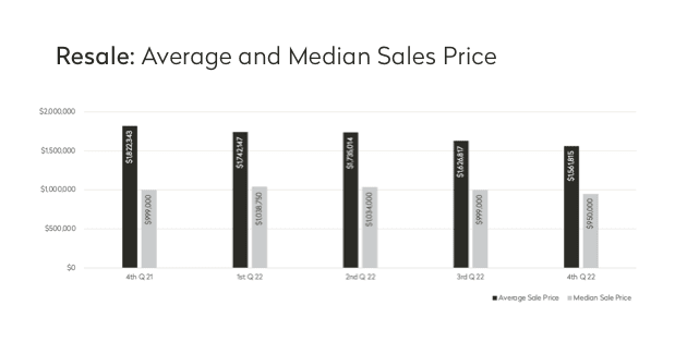 Here it’s important to note that the average sales prices for Manhattan were in great part supported by strong New Development sales which on average saw an 11% rise from $3,257,477 in Q4 2021 to $3,626,070 in Q4 2022. This uptick in high-end New Development closings helped balance the softening in resale figures which averaged $1,561,815 in Q4 2022 compared to $1,822,343 for the same period a year ago, a 14% drop illustrating the impact that economic conditions and interest rates have had on property values. Resale co-ops only dropped 5% from last year whereas resale condos fell about 19% overall as fewer high-ticket resale 3+ bedroom condo averages dropped to $4,772,983 in Q4 2022 from $6,808,444 in Q4 2021.