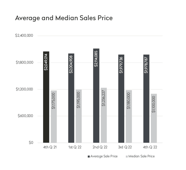 The average Manhattan apartment sales price was $1,978,787 in Q4 2022 which is virtually unchanged from the prior quarter when it was $1,987,736. The average apartment sales price declined approximately 3% from the same time last year when it was $2,049,014.