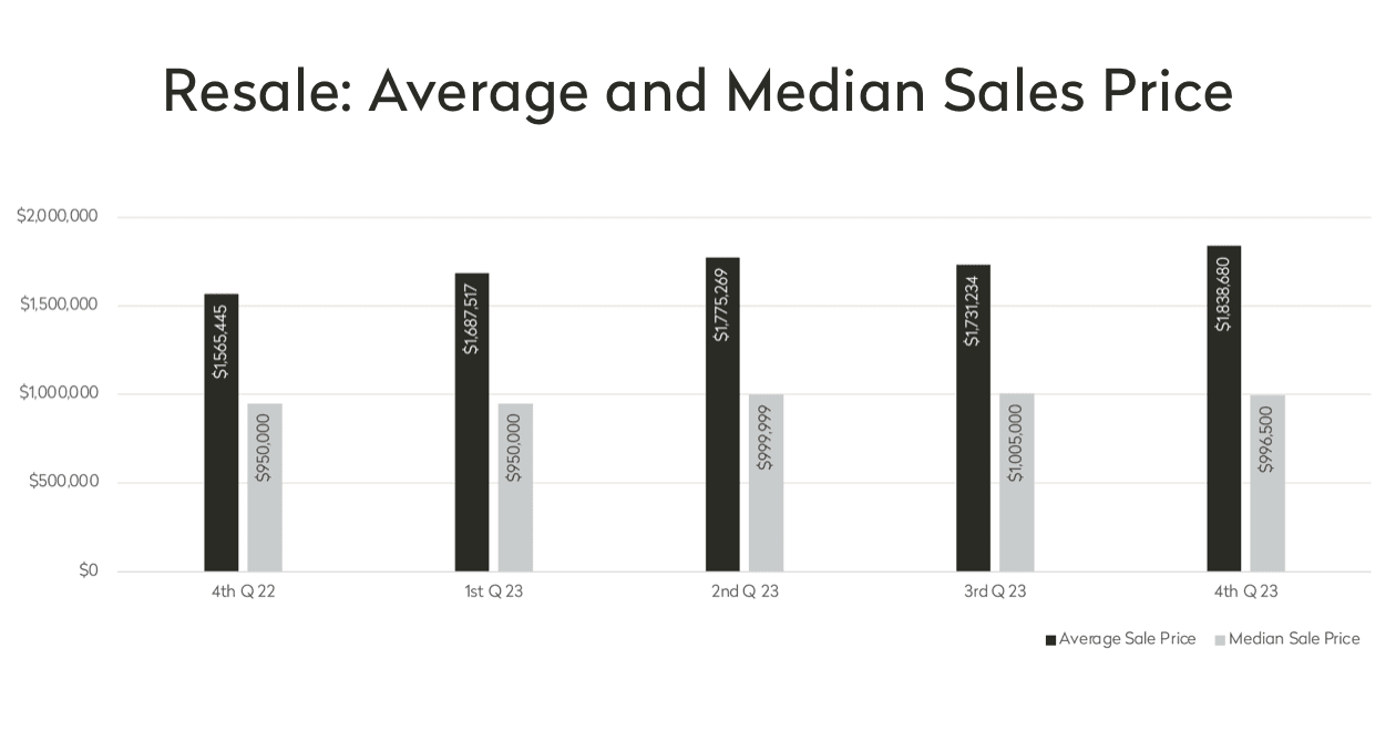 The average price of resale apartments came in unusually high due to four condo trades over $65M that brought the average price up 17% to $1,838,680 from $1,565,445 last year. We see the impacts of those large trades in the average price of 3+ bedroom condos which reported an average sales price 71% higher than last year: $8,511,938 in Q4 2023 compared to $4,968,300 in Q4 2022. By comparison, 3+ bedroom co-ops had an average sales price of $3,245,204 compared to $3,180,555 a year ago, representing a 2% increase.