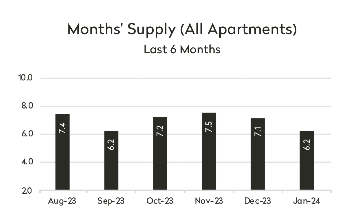 While the slowdown in deal activity toward the end of the year saw listings accumulating on the market between September and November 2023, the supply rate began to decline in December when it was 7.1 months. It isn’t unusual for us to see this kind of pullback this time of year as there are sellers who take their homes off the market to wait for activity to kick back in.
