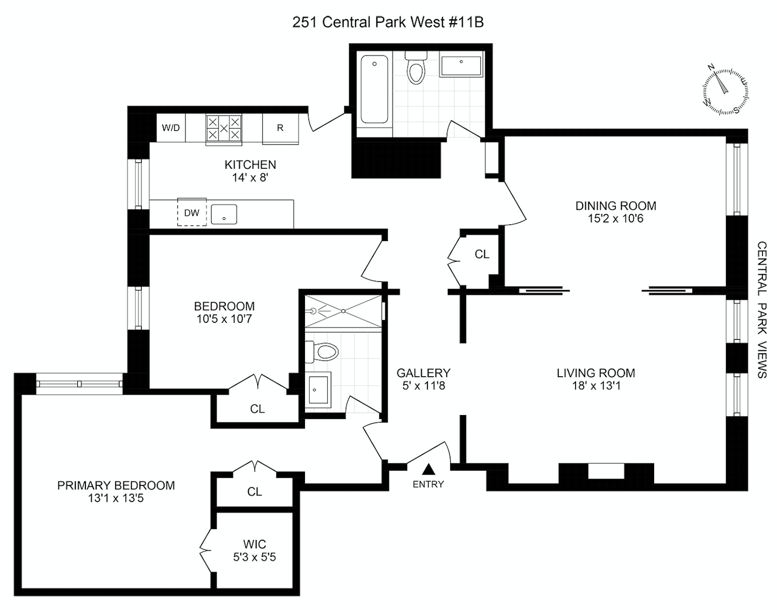 A semi-private elevator landing opens into the apartment's gracious gallery off which the living room flows offering views pouring directly over Central Park through oversized picture windows. Immediately adjacent to the living room through a pair of pocket doors is an elegant formal dining room also offering direct park views which could easily function as a third bedroom, if needed. The newly renovated windowed kitchen is perfectly situated directly opposite the dining room and has been equipped with all new stainless steel appliances, quartz countertops with dramatic grey veining, custom shaker cabinets and a washer and dryer that vents to the exterior.