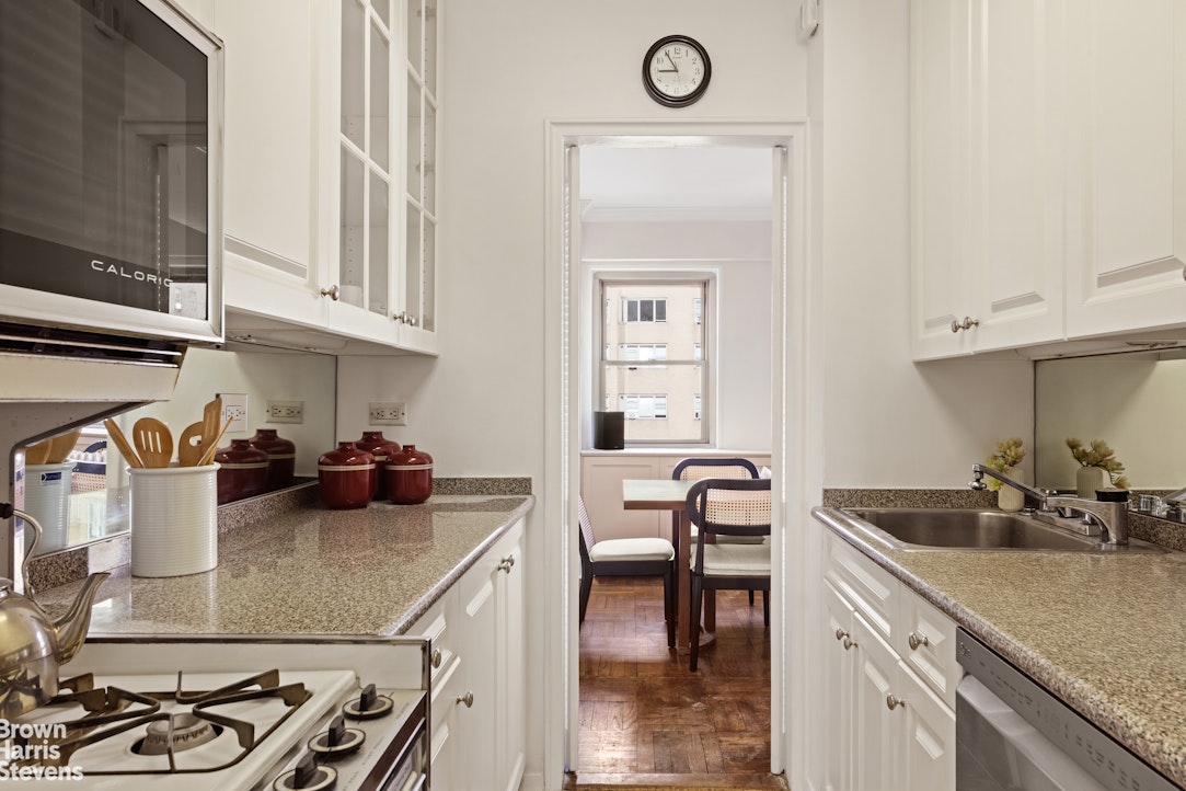 Enter into an oversized gallery surrounded by three generous closets and be drawn immediately into a massive living room with a wall of windows drawing in warm sunlight from the West, directly over Park Avenue and its verdant meridians. The living room pours into an adjacent windowed dining area, allowing for flexibility when hosting large dinner parties or holiday gatherings. The kitchen is just next to the dining area behind a pair of twin doors to discreetly close off the space when entertaining. The kitchen has excellent storage and counter space, enhanced by custom cabinetry with counter lighting and a pantry. There is a refrigerator/freezer, a gas stove with convection oven as well as a full-sized stainless steel dishwasher.