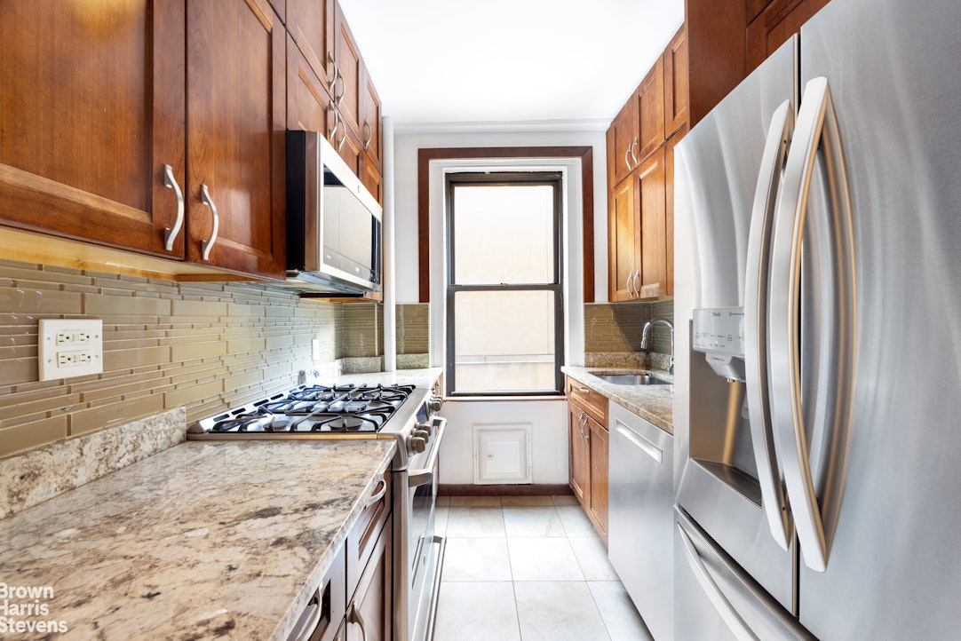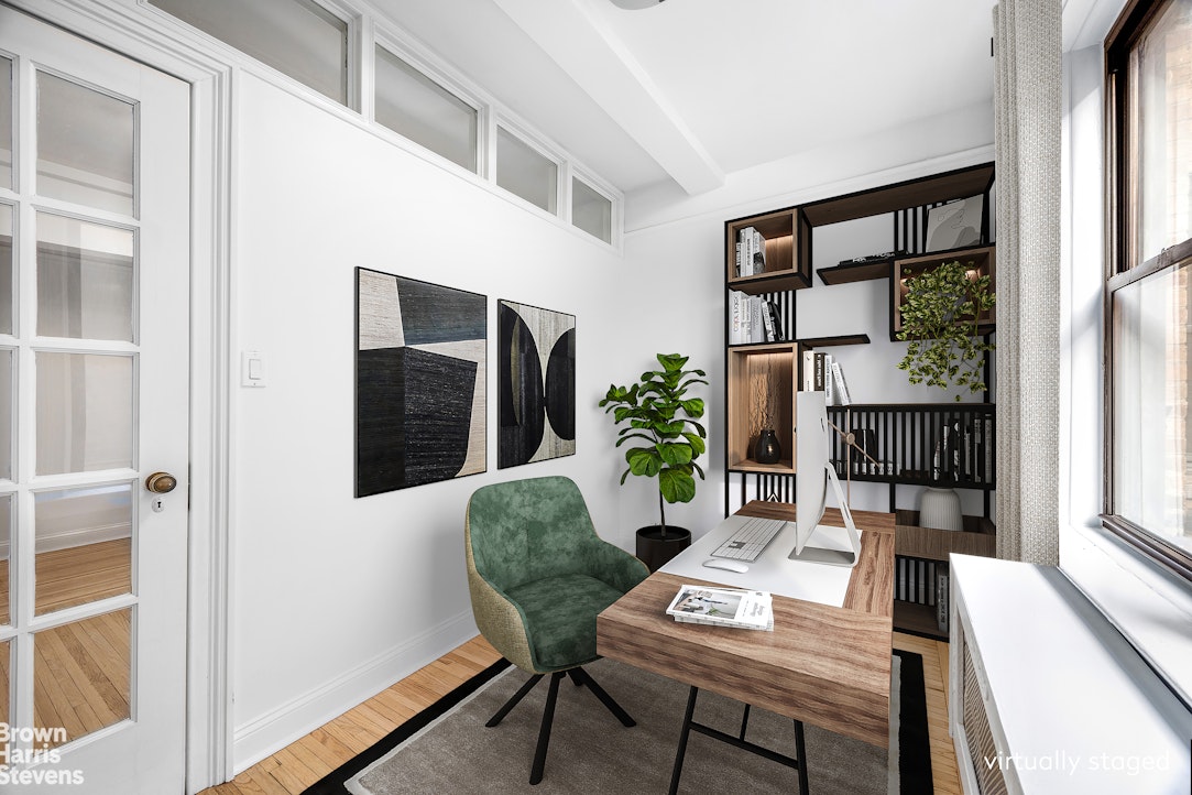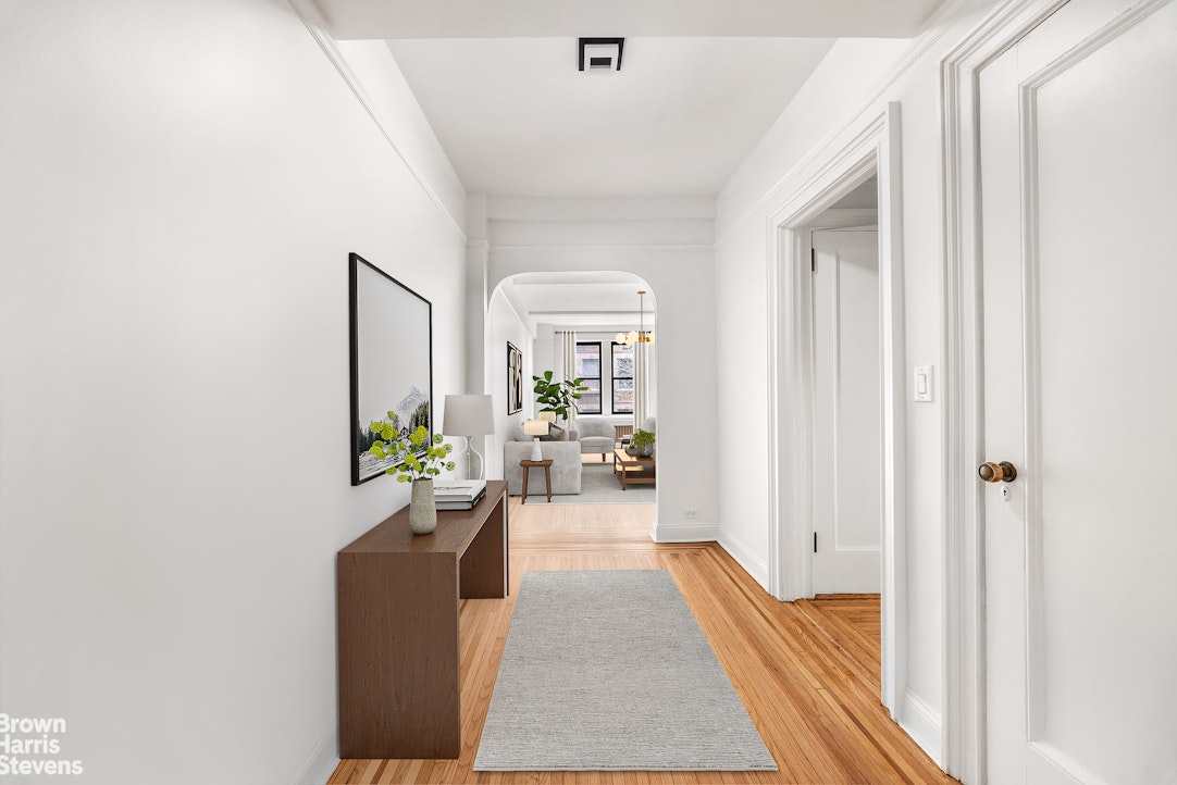 A gracious entry gallery welcomes you, at the end of which lies a massive living room stretching nearly 22 feet deep, anchored by a pair of oversized double hung windows overlooking the treetops of West 84th Street. Beamed ceilings rise over 9 feet overhead, and newly refinished hardwood floors with elegant inlays run throughout the entire home. There is a dedicated dining space with transoms drawing in eastern light, perfectly enclosed for festive dining and ideally situated adjacent to the kitchen.