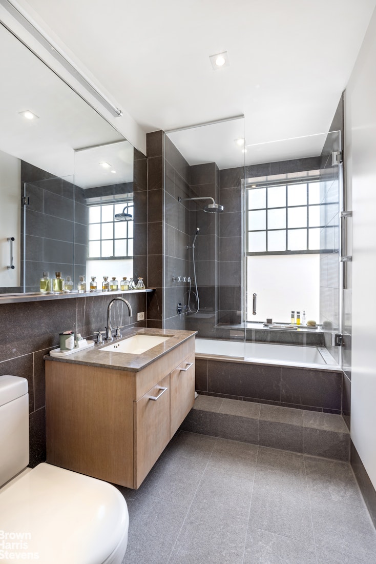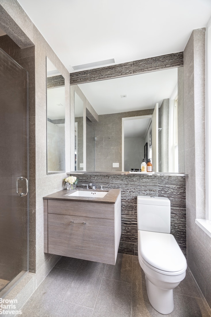 The principal bedrooms are serenely located in a dedicated wing of the home with the primary bedroom suite occupying the building's northwest corner. There is an oversized custom walk-in closet and an en-suite windowed bathroom with Waterworks Monterey flamed floor-to-ceiling tiles, chrome hardware and a stall rain shower. The second bedroom overlooks tree-lined East 83rd Street to the North and has four custom closets, including a large walk-in. The second bedroom is serviced by a sizable hall bathroom with an oversized vanity as well as a glass-enclosed deep soaking tub affront a large frosted glass window.