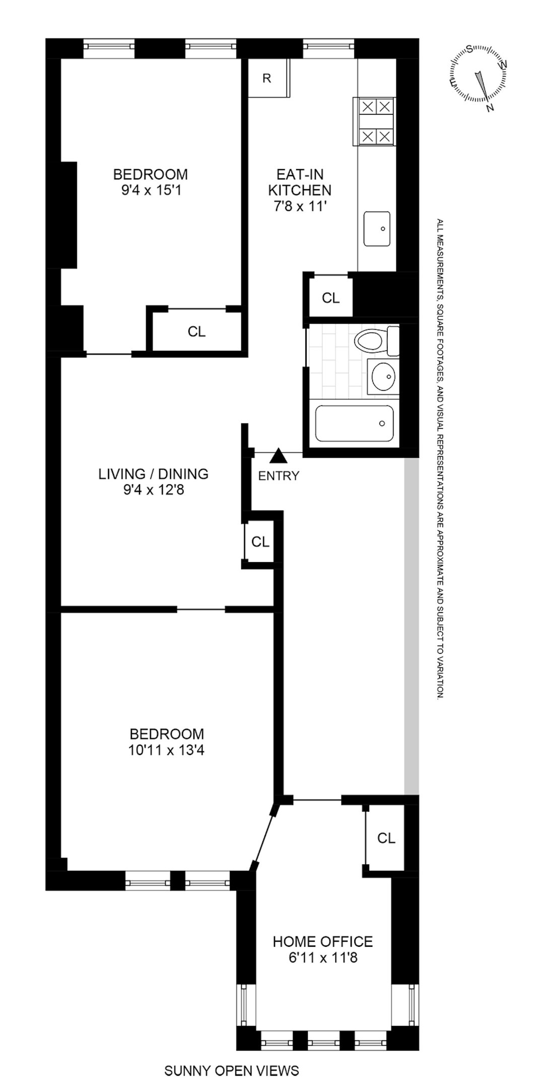 There is a gorgeous newly renovated windowed eat-in kitchen with subway-tile backsplash and white stone countertops, enhanced by abundant cabinet storage as well as a huge dedicated pantry. The kitchen is exposed South with plenty of space for a breakfast bar and is appointed with an oversized sink basin, a stainless steel refrigerator, a full-sized gas range/oven as well as a mounted microwave.