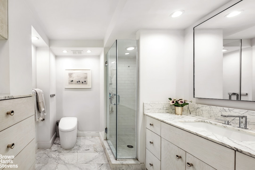 The third bedroom is flexibly located to the north of the entertaining spaces, entirely overlooking Park Avenue. It has excellent closets and storage and an oversized en-suite bathroom finished in marble and white subway tile with Lefroy Brooks hardware, a glass semi-enclosed deep soaking tub and generous storage. It can easily be used as a third full bedroom or guest suite, as a library/home office or easily opened to further expand the grand entertaining space, as per your needs.