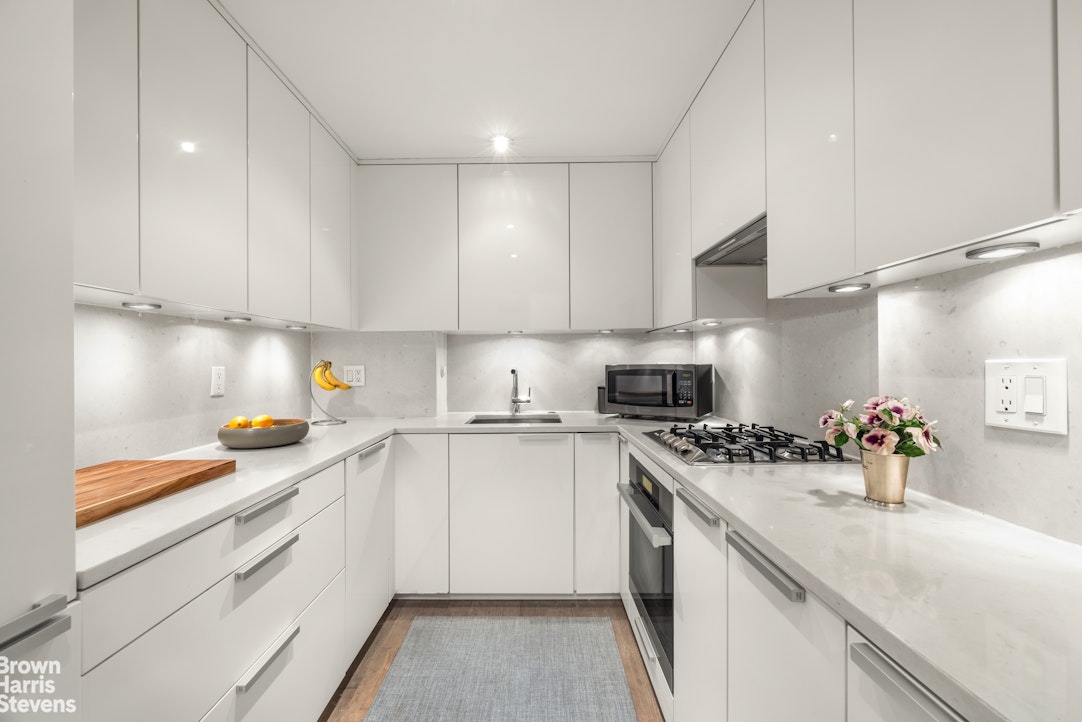 Perfectly situated between the home's entrance and entertaining areas, the kitchen is thoughtfully appointed with wall-to-wall custom lacquered cabinetry, quartz countertops and backsplash and a suite of Miele appliances including a gas cooktop with a vented hood, an oven and a dishwasher. The refrigerator features an ice maker and water filtration, and there is a garbage disposal integrated into the sink. The kitchen can remain elegantly enclosed or it can easily be opened into the entertaining spaces, as per your taste and needs. This grand entertaining wing is also serviced by a discrete powder room ideally located just off of the foyer.