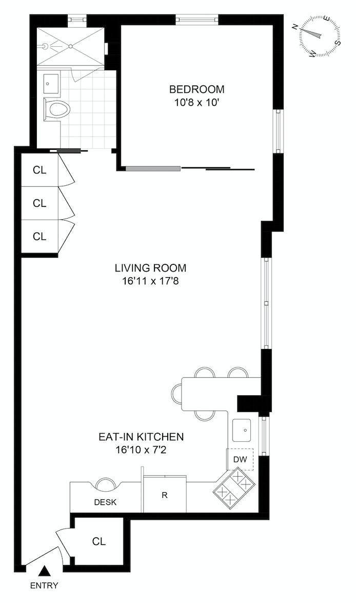 Reminiscent of a loft, a sprawling double-windowed living room provides a wide-open space for lounging and entertaining, flowing seamlessly into a windowed eat-in kitchen with built-in breakfast bar that can comfortably accommodate as many as four. The kitchen has beautiful custom wood cabinetry, Costa Esmeralda granite counters and stainless steel appliances including an oversized French door-style LG refrigerator, dishwasher and 4-burner gas stove. For those who work from home, there is a fully integrated desk with additional drawers and cabinetry just off of the kitchen.
